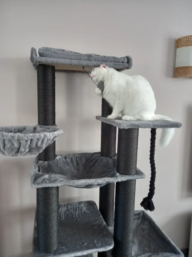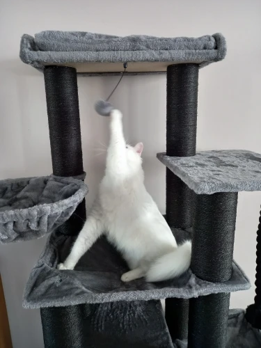 Ottimo tiragraffi con un rapporto qualità-prezzo imbattibile. Tutti i tiragraffi hanno una corda e sono molto spessi. Alcuni gatti potrebbero trovare un po' più difficile arrampicarsi fino alla parte superiore a causa dei cestini. E mi sembra che misuri un po' più di quanto indicato, forse almeno 175 cm...