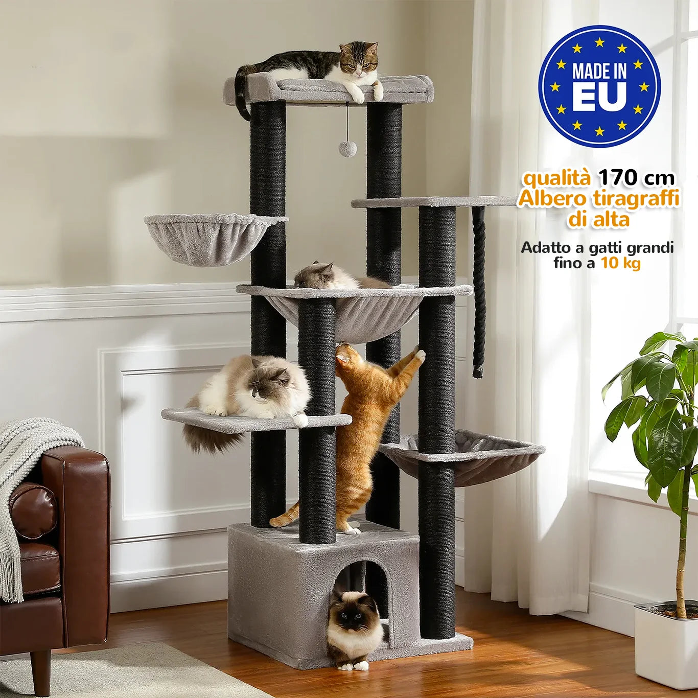 Il MegaPaws™ – Albero Tiragraffi XXL 170 cm è progettato per ospitare più gatti contemporaneamente, anche di grossa taglia, grazie a una struttura solida e stabile con 11 pali in sisal e una base rinforzata.